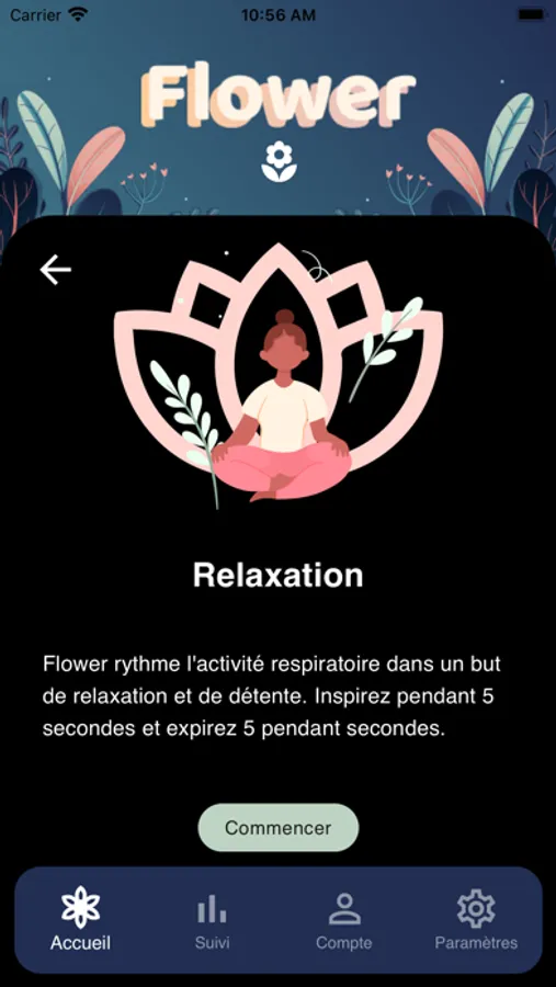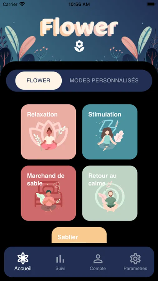 Connectez vous à votre dispositif Flower et suivez les guides de relaxation, de concentration et de gestion du temps pour une journée plus sereine et productive. Flower utilise des stimulations visuelles permettant de guider votre respiration pour vous relaxer, vous aider à vous endormir ou vous stimuler. Les modes de gestion du temps peuvent également vous aider à organiser temporellement vos tâches et à vous repérer dans votre journée. Grâce à l'application Flower, vous pouvez créer des modes personnalisés en choisissant les couleurs, les rythmes de respiration.