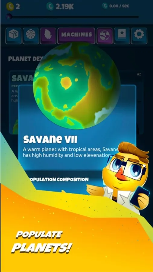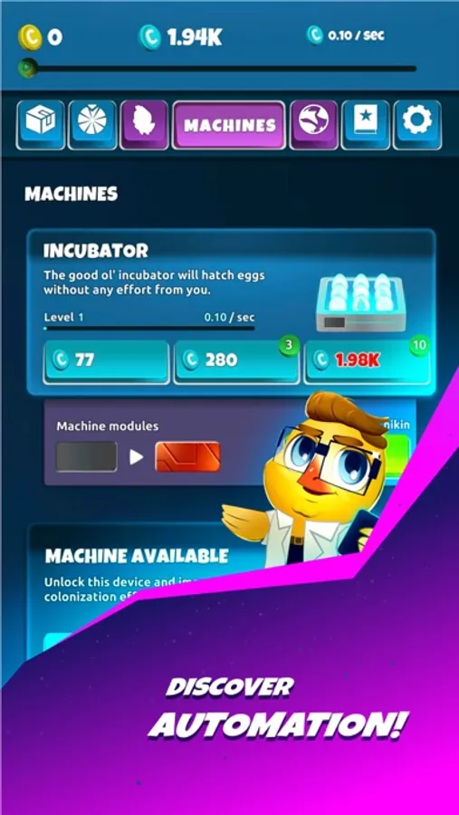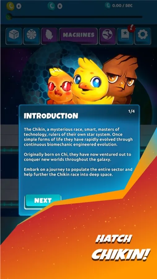 Tap your way, buy machines and discover the power of automation in an amazing idle game set in space! Help the Chikin (not to be confused with chicken) build space colonies, populate planets, and conquer Sector Alpha.
