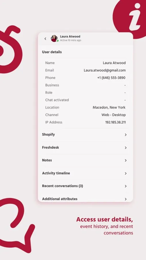 View user details, notes added by other agents, recent conversations, and other data during the chat.
