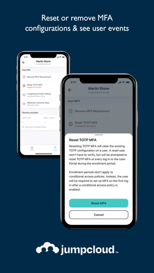 The JumpCloud Admin app gives you, the admin, the power to quickly resolve common user requests while on the go. You can reset passwords, unlock user accounts, remove MFA requirements, and see user events.