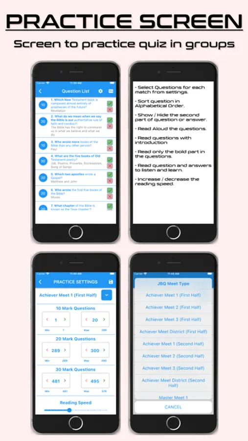 You can select the questions that you need to show in the list. Once you select the question you or the quizzer need to practice tap the “Read” button and the app will read the questions for you. When the quizzer intercept the questions then tap on the stop button to If the quizzer answered the question correctly, then you can click the correct button and the application will speak an appreciation for the correct quizzer.