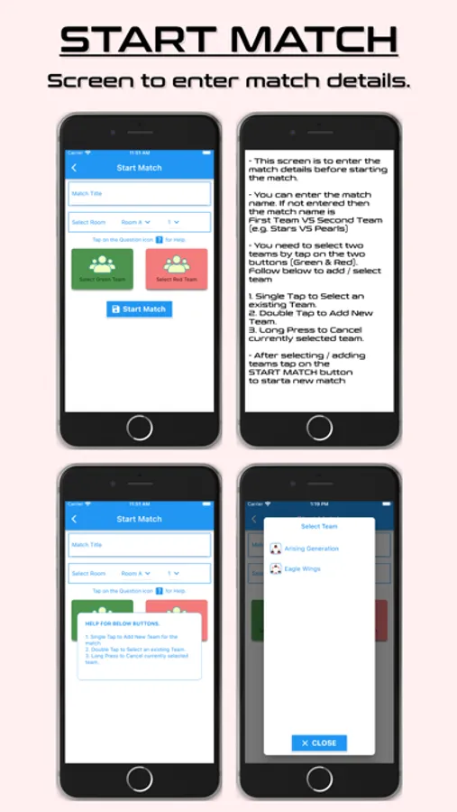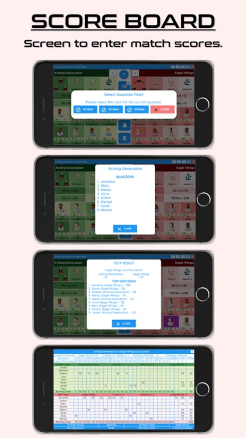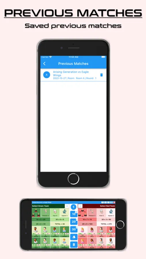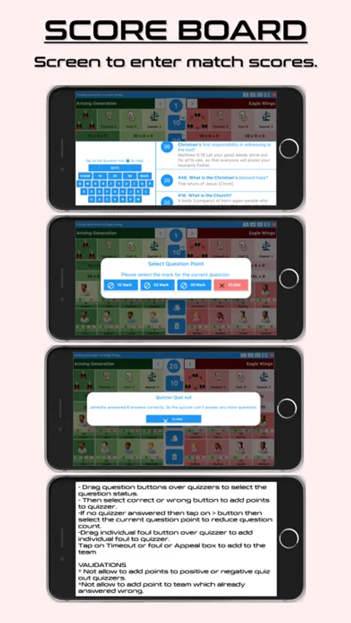 Start New Match tab is the place where you can enter the scores for the quizzes instead of using the score sheet. It has three buttons for time out. It has three buttons for Judges ruling. When you use the time out or Judges ruling you can tap one button and it will display appear then only the remaining time out buttons will be displayed. When the quizzes answer the questions tap on the points of the question and then tap on the quizzes name, so the points will be added to the quizzer. It will also display how many points a team can earn maximum.