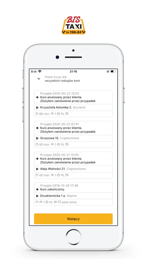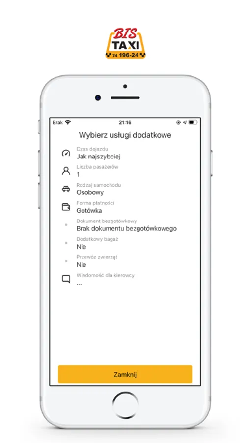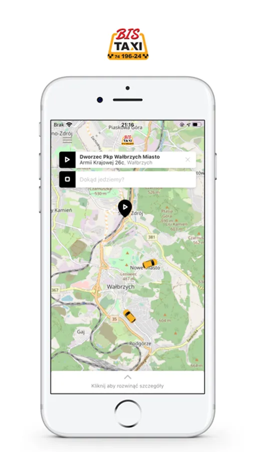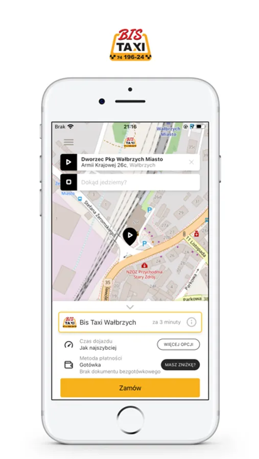 Zamawiaj jednym dotknięciem w aplikacji TAXI BIS w Wałbrzychu i okolicach. Aplikacja jest gotowa do zamówienia od razu po uruchomieniu. Podpowiada ulubione ustawienia, adresy, sposoby płatności i specjalne cechy kursu. Zajmuje bardzo mało miejsca a jest dostępna w 6 językach. Pokazuje auta BIS TAXI online i pozwala na śledzenie tego zamówionego. Można ponownie wybrać kurs z historii. Dowolnym komunikatorem można informować "gdzie jestem?". Umożliwia bezpośredni kontakt się z kierowcą BISa i pokazuje za „ile będzie taksówka?” a na koniec poprosi o ocenę przejazdu. Aplikacja umożliwia zamówienie wielu przejazdów jednocześnie a gdy TAXI BIS już przyjedzie w telefonie wyświetli się specjalne powiadomienie push.