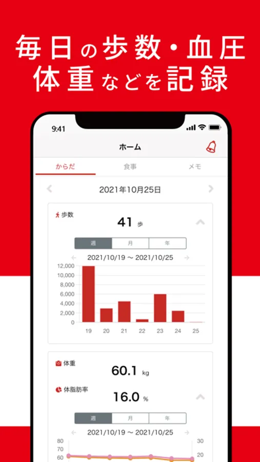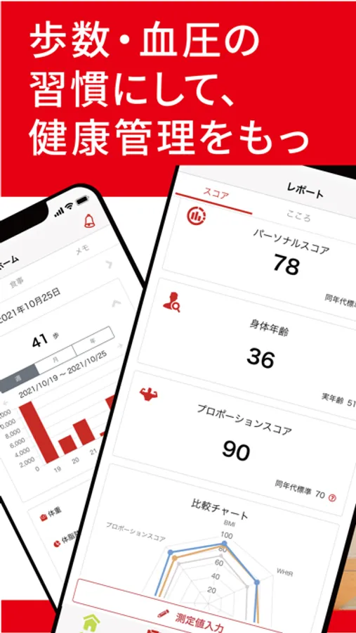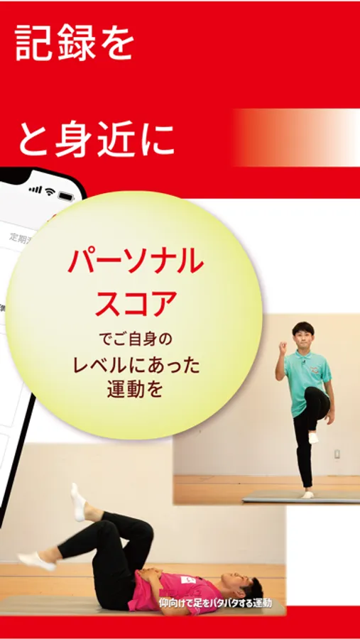 歩数や血圧・体重・体脂肪率・腹囲などを記録して、自身の健康状態を見える化しましょう!レベルに合ったトレーニング動画や、地域イベント・健康情報をお届けします。