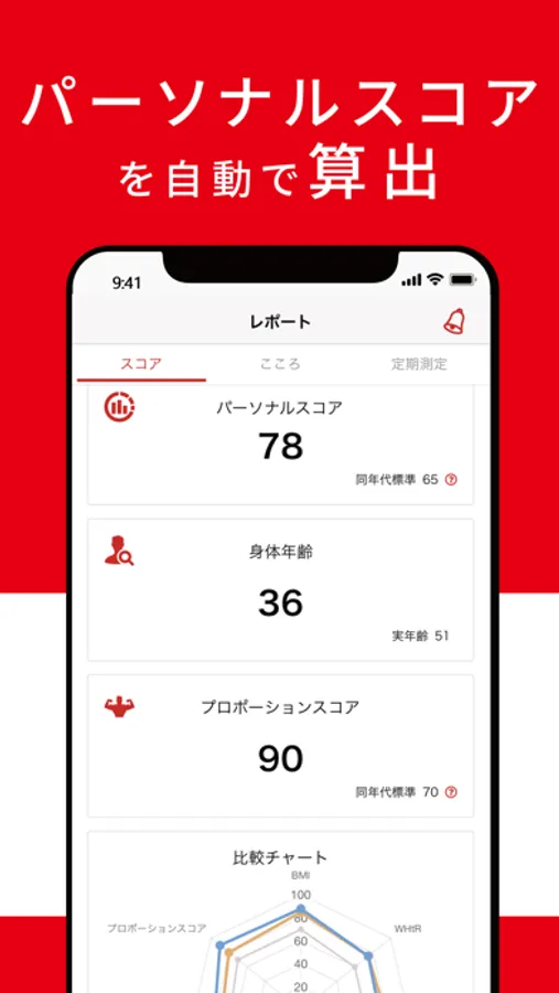 パーソナルスコア・身体年齢・プロポーションスコアを把握できます。