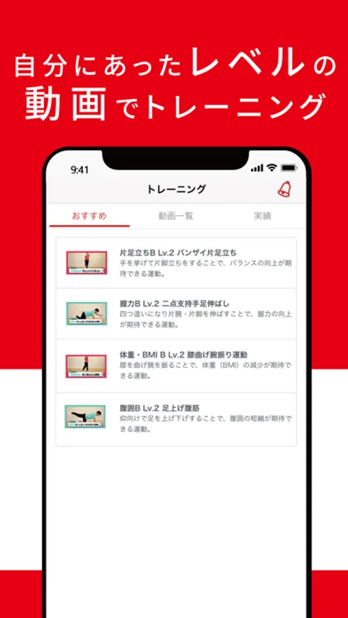 入力したデータから導き出した、ご自身のレベルに合ったおすすめ動画を再生して、適切なトレーニングが可能です。