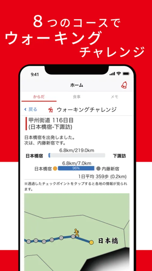 8つのコースから挑戦したいコースを選び、踏破状況を確認しながらウォーキングすることができます。