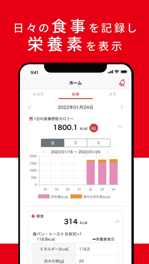 日々の食事内容を登録し、1日の食事摂取目標に対する摂取量や、栄養素を表示することができます。