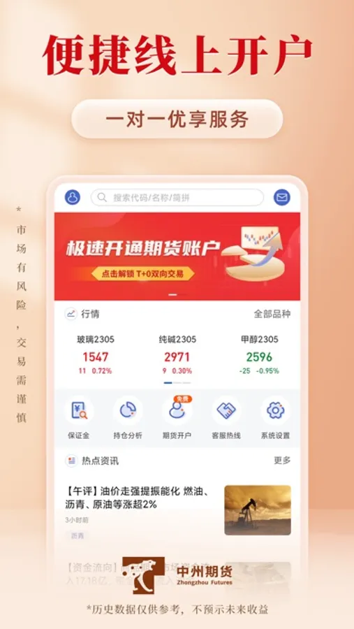 中州期货期货通是一款提供行情资讯,手机开户,期货资讯,掌上交易等一体的一站式专业期货软件。内涵原油、贵金属、股指等多个热门品种,致力于帮助用户在交易中赢得先机。此外中州期货通提供全面丰富的行情资讯给广大投资期货爱好者。