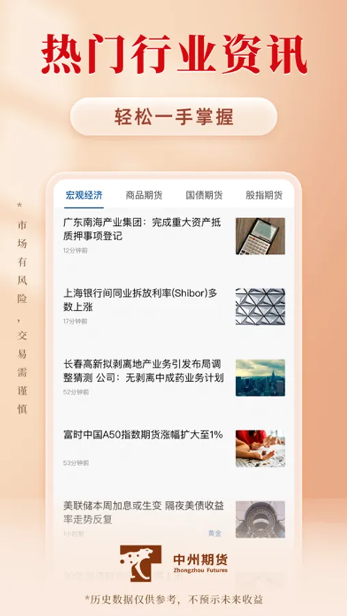 中州期货主营:商品期货经纪、金融期货经纪、期货投资咨询、基金销售、资产管理业务,是上海期货交易所、大连商品交易所、郑州商品交易所、中国金融期货交易所及上海国际能源交易中心的正式会员,可以交易上述交易所所有上市品种,能够满足国内外投资机构、保值商以及广大投资者对财富投资管理及风险管理控制的需求