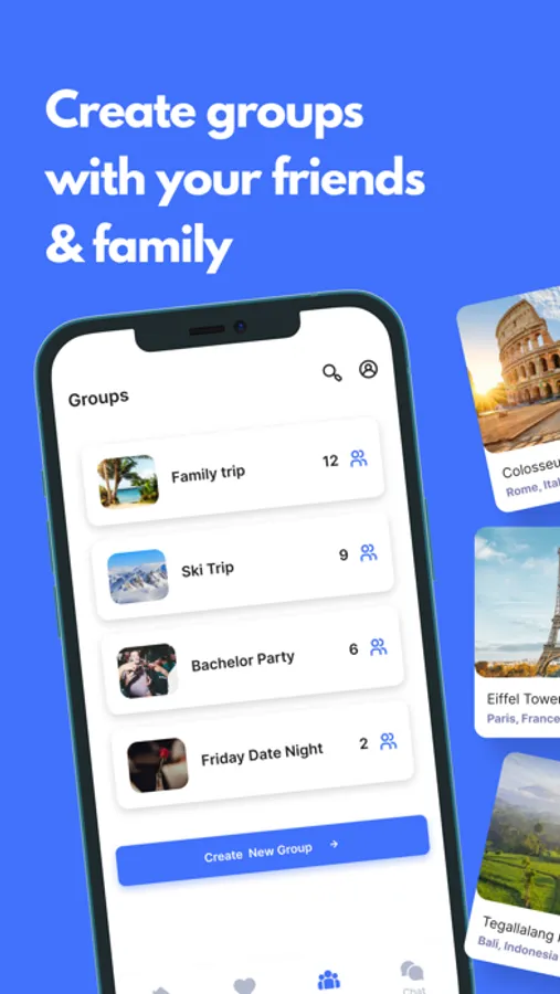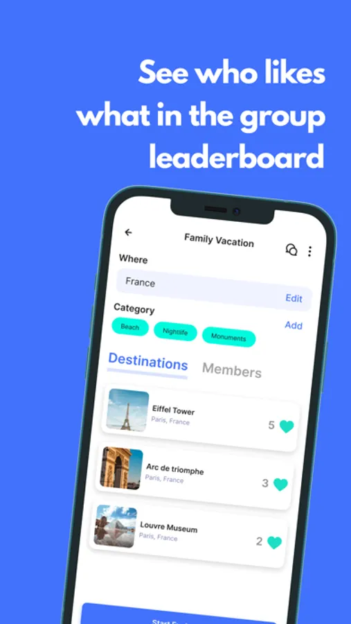 Connect with like-minded travelers in a larger group enabling each traveler to provide inputs on destinations via swipes.