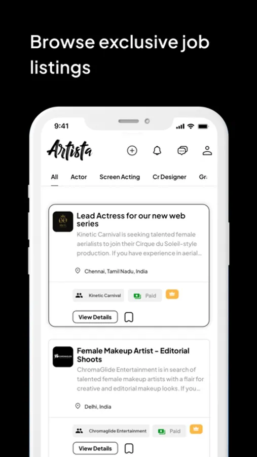 Artista App is a job search app that helps artists to find connections and openings. With Artista, recruiters in the media and entertainment sector can quickly find their cast. No matter what type of artist you are—actor, model, singer, dancer, writer of screenplays, painter, influencer, photographer, or makeup artist—ArtistaApp.in is the ideal platform for you to display your skills and get hired. So why wait? Create your profile on Artista and add a portfolio to get started. Install the app right now.