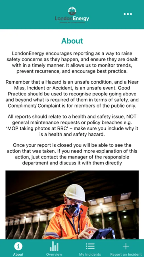 LondonEnergy encourages reporting as a way to raise safety concerns as they happen, and ensure they are dealt with in a timely manner. It allows us to monitor trends, prevent recurrence, and encourage best practice.