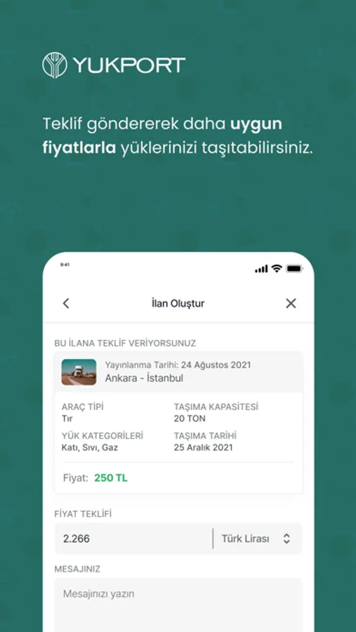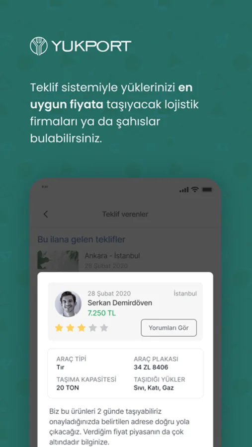Yüzlerce lojistik hizmet sağlayıcıyı ve binlerce yük taşıtan büyük firma’yı bünyesinde barındıran Yükport ile taşıma yaptırmak ve taşımak için yük bulmak çok kolay. Açacağınız tek profil ile ister yük taşımak için teklif verin isterseniz de yükünüzü taşıtmak için taşıyıcı bulun. Her şekilde en kazançlı siz olarak gelişmiş bir lojistik ağında yerinizi erkenden alabilirsiniz. Çift yönlü teklif sisteminin size kazandıracaklarını kaçırmayın.