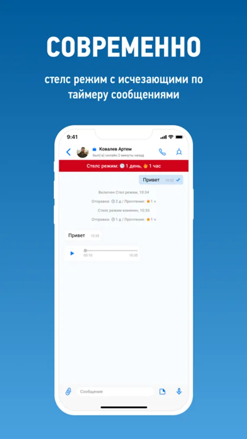 - Современно. Стелс режим с исчезающими по таймеру сообщениями