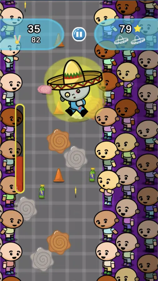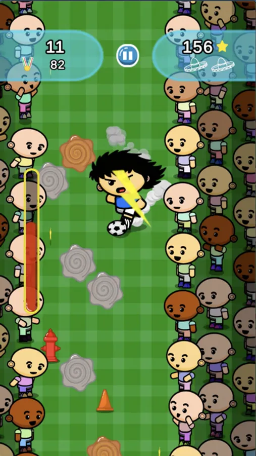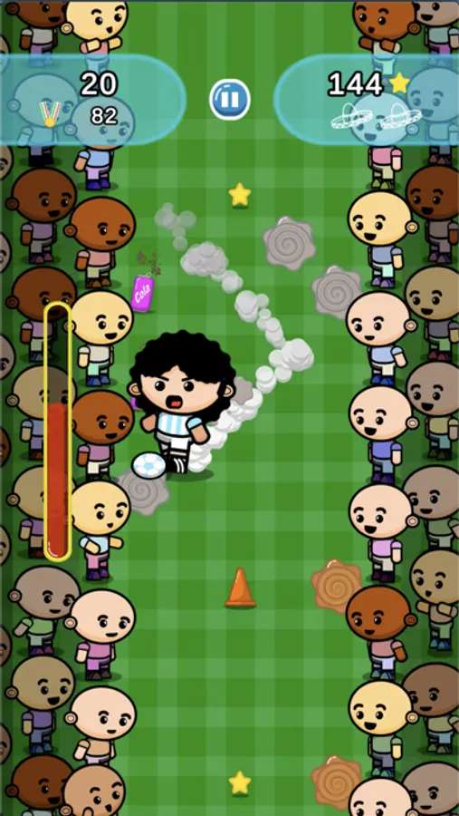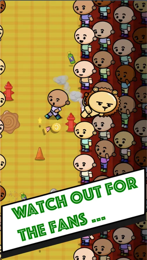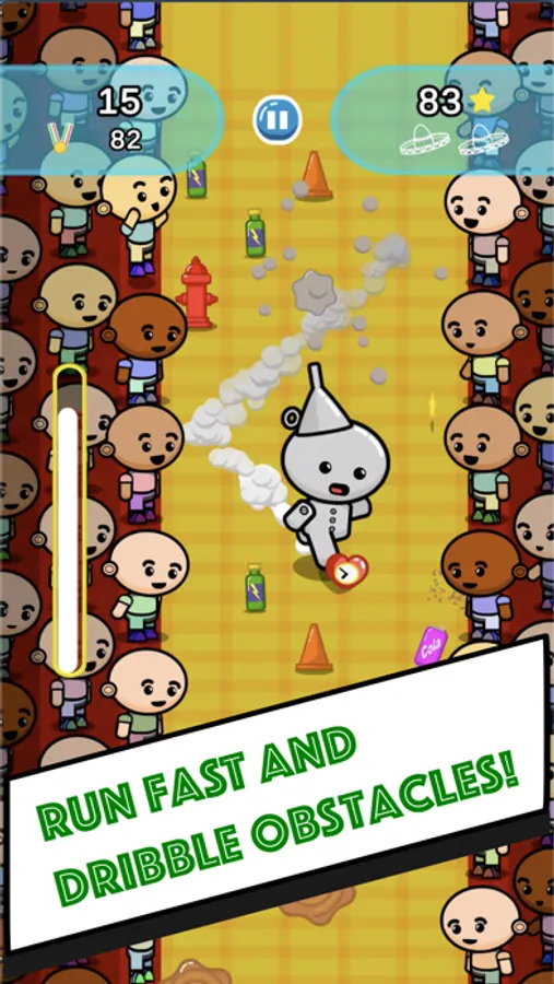 Avoid cones or fire hydrants and especially the fans on the sides of the pitch; beware of puddles you can slip on or mud that can slow you down; Take energy drinks to recover from fatigue, but don't drink the cola that makes you stomach ache! Collect stars that will allow you to resume the game even after tripping!