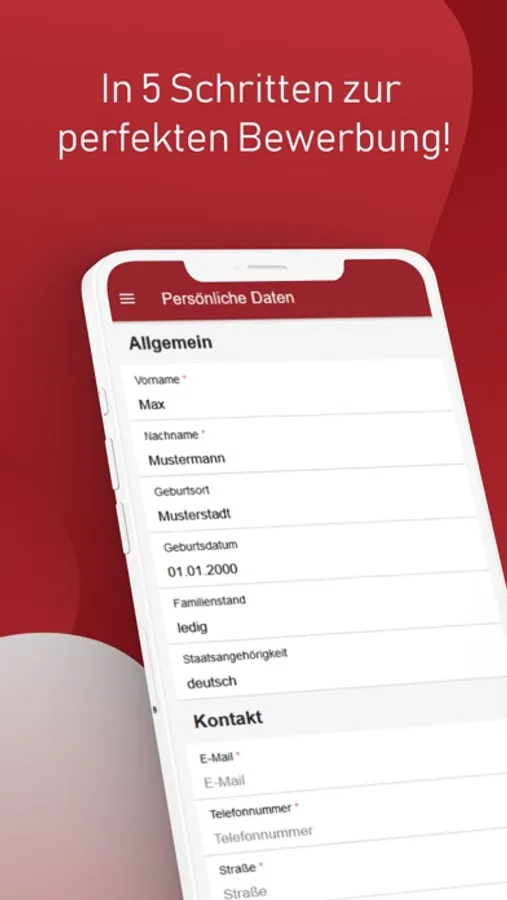 Der Ablauf ist ganz simpel: Du trägst Schritt für Schritt alle Daten ein, die für deine Bewerbung wichtig sind und am Ende bekommst du eine maßgeschneiderte Bewerbung in einem modernen Design. Diese kann von dir als PDF-Datei verschickt werden - direkt aus der App!