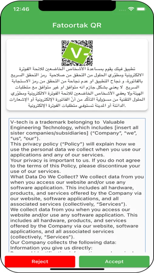 هذا التطبيق يقوم بمساعدة الأشخاص الخاضعين للائحة الفوترة الالكترونية ومطوّري الحلول من التحقق من صلاحية رمز التحقق السريع بالفاتورة، و نجاح التطبيق او عدم نجاحة من التحقق من رمز الاستجابة السريع لا يعني بشكل جازم انه متوافق او غير متوافق مع متطلبات الهيئة،ولا يعفي الأشخاص الخاضعين للائحة الفوترة الالكترونية ومطوّري الحلول التقنية من مسؤولية التأكّد من أنّ الفاتورة الإلكترونية أو الإشعارات الدائنة أو المدينة تستوفي متطلبات الفوترة الإلكترونية