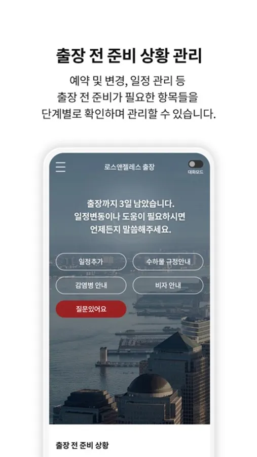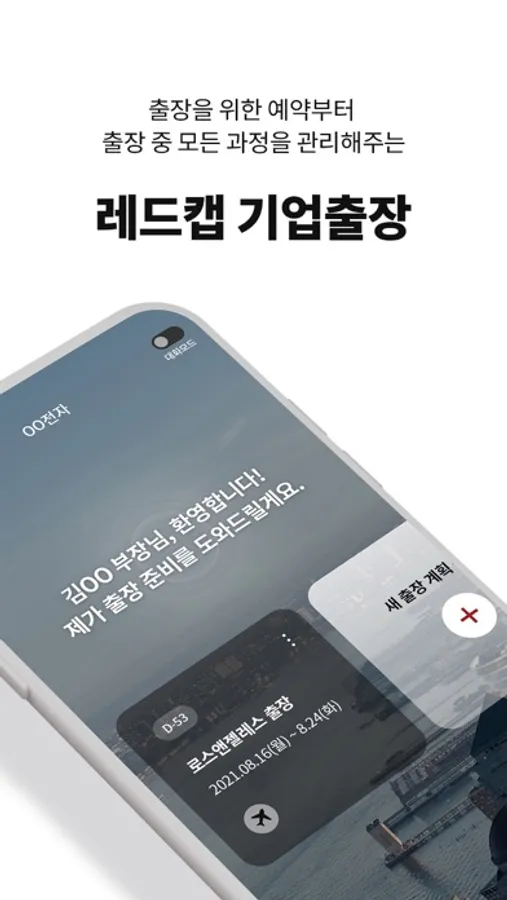 - 출장 준비 과정 뿐만 아니라 여정 계획 관리, 출장 중 발생가능 한 돌발상황 대처까지 빠르고 편리하게 모바일 앱으로 서비스를