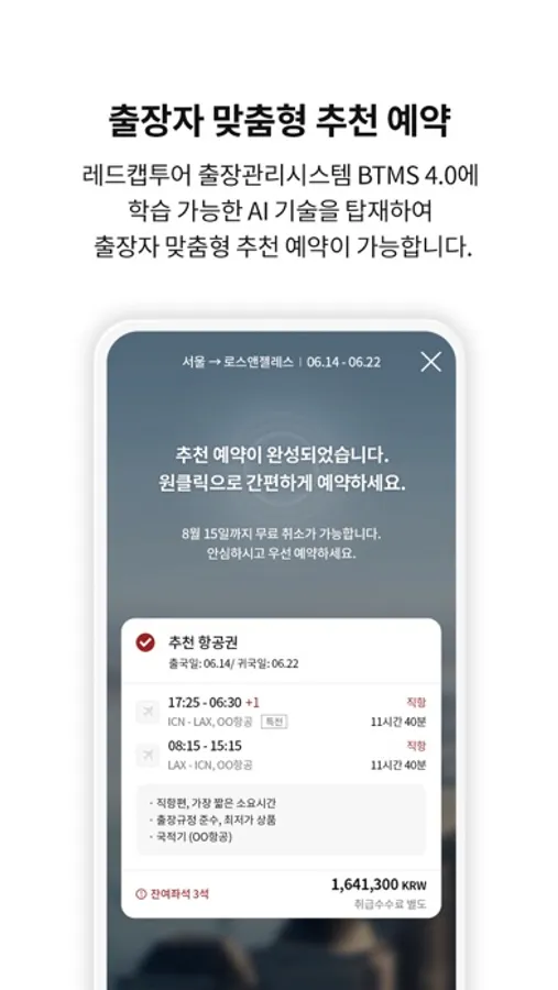 - 레드캡투어 출장관리시스템 BTMS 4.0에 출장자 경험을 데이터로 학습 가능한 AI 기술을 탑재하여 출장자 맞춤형 추천 예약이 가능합니다.