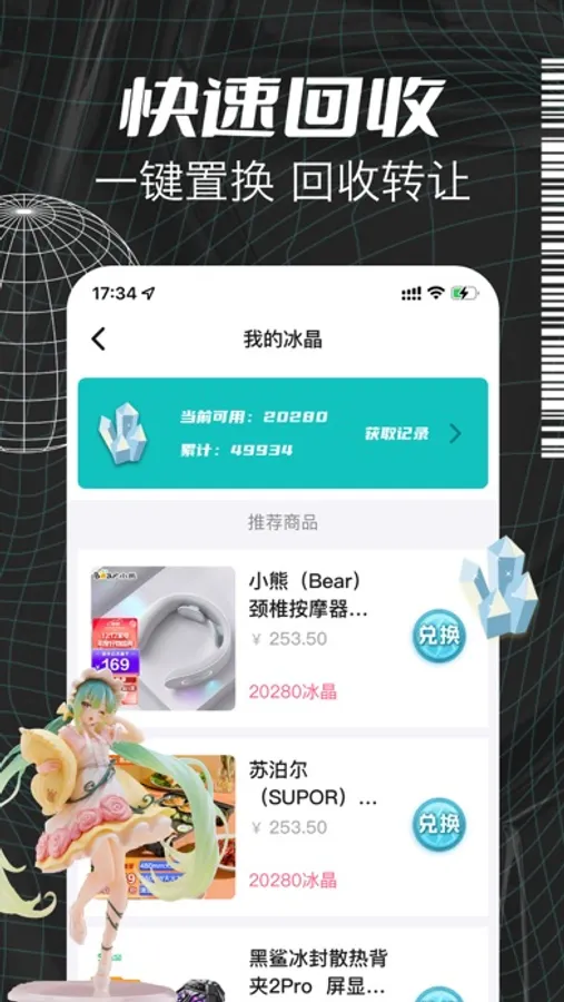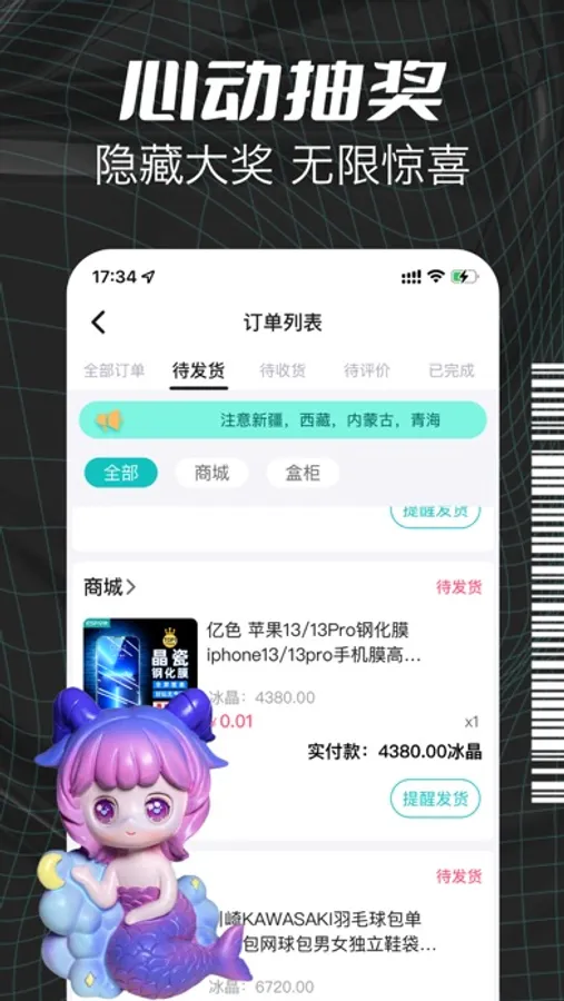 神秘开盲盒总能带给你无限的期待与惊喜! 好运不断,惊喜抽不断,app支持回收功能,抽到不喜欢的商品可以卖回给平台换取冰晶,通过冰晶来商城换取你喜欢的宝贝,100%可回收。抽到自己喜欢的商品或者冰晶兑换到商品可以直接领取,一律包邮到家,抽中即可领取,快进来开个盒子,试试你的手气吧!