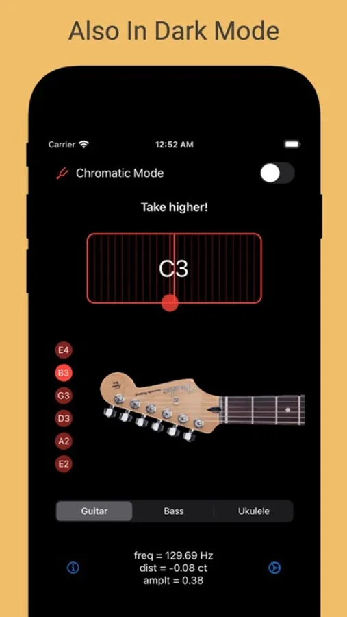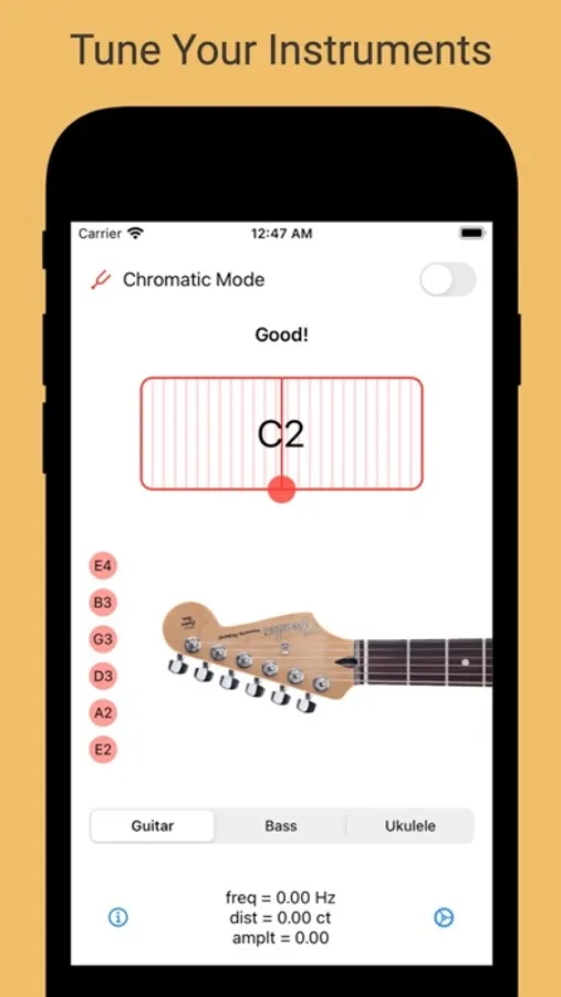 This app is very fast, sensitive, and recognizes all strings using the built-in mic.