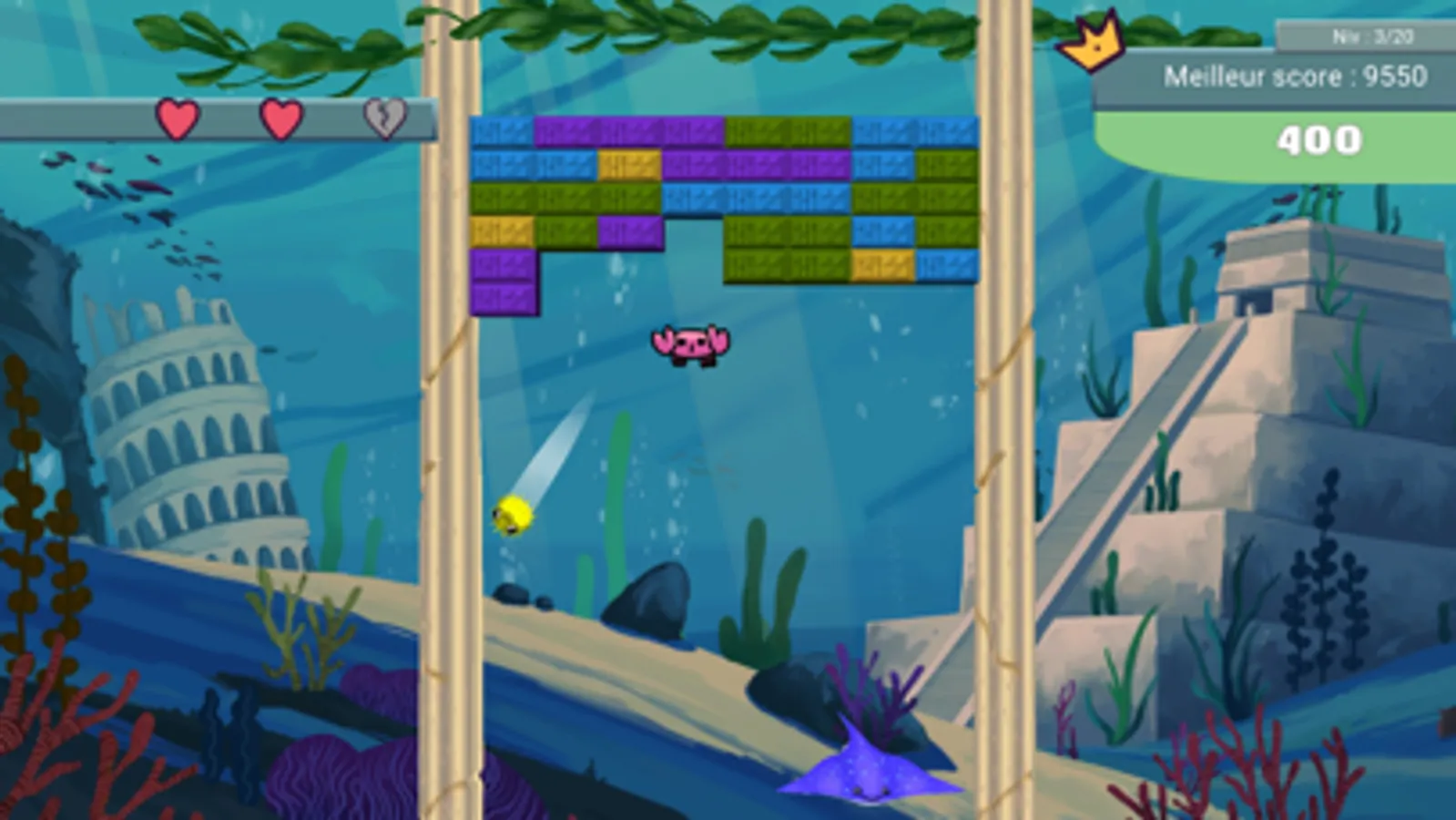 Go under the sea in "Brick Breaker" and get help from a manta ray and a sunfish to unlock all 20 levels of the game. Destroy all the bricks in a level to complete it and unlock the next.