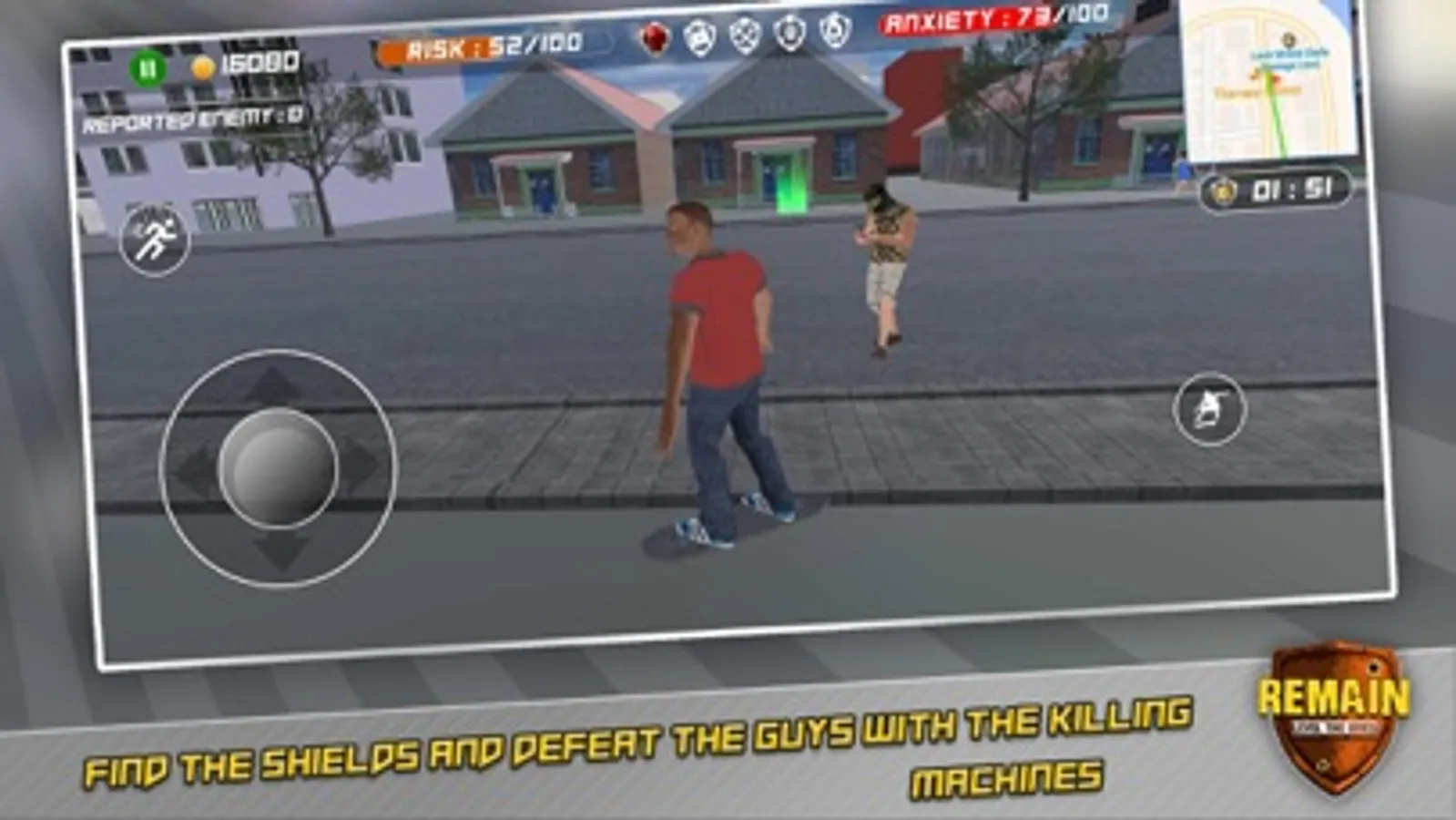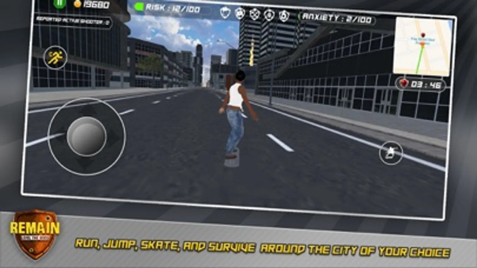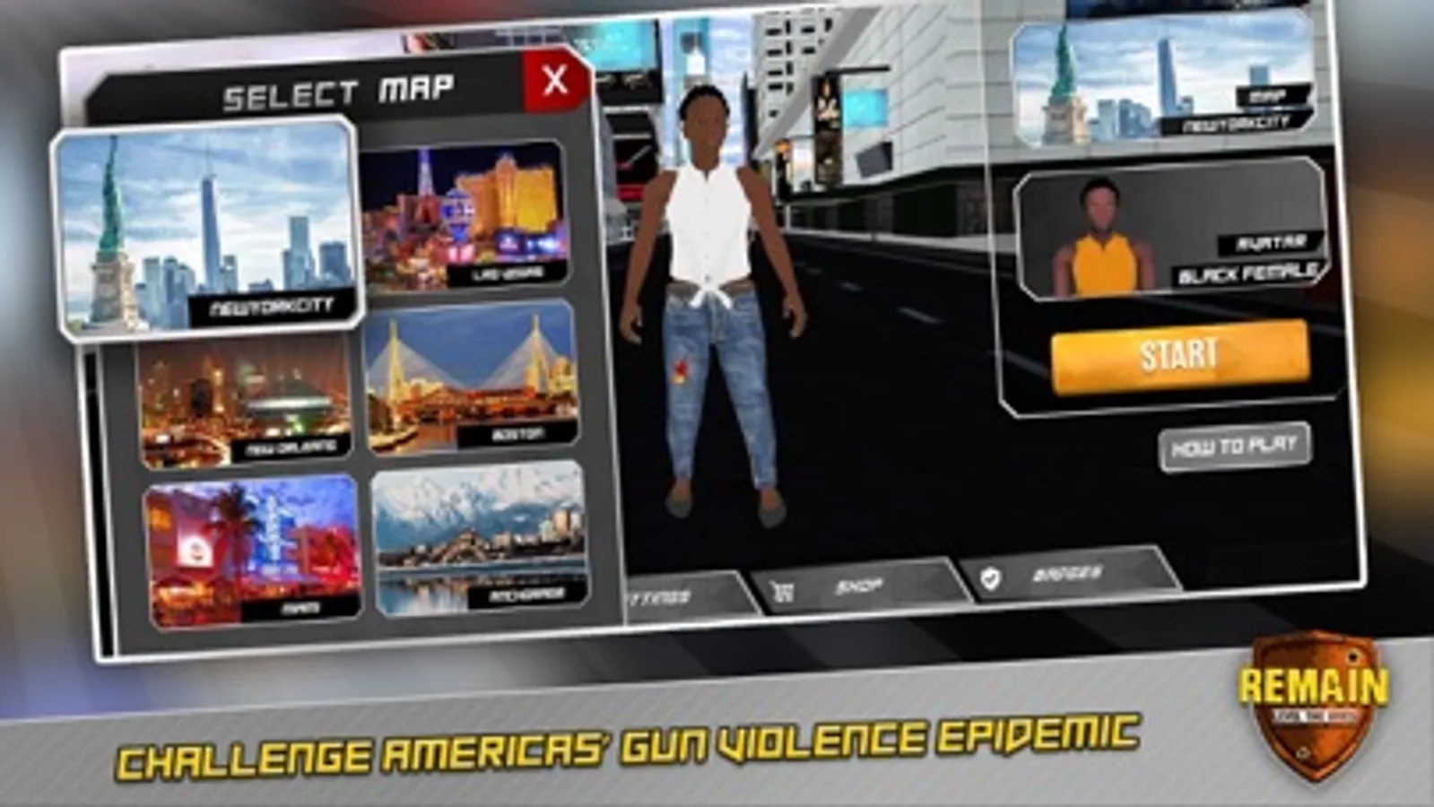 Remain is the first Mobil Video Game that takes America's real-life gun violence data and turns it into obstacles in an actual life experience. Here you will get to see the point of view of those living in places where your gender identity, skin color, and neighborhood can threaten your very own existence. During the game, and to protect itself, the player will need to find magic shields of Gun regulations. Every time a magic shield is found, the player's risk level will decrease. The final goal is to REMAIN alive.