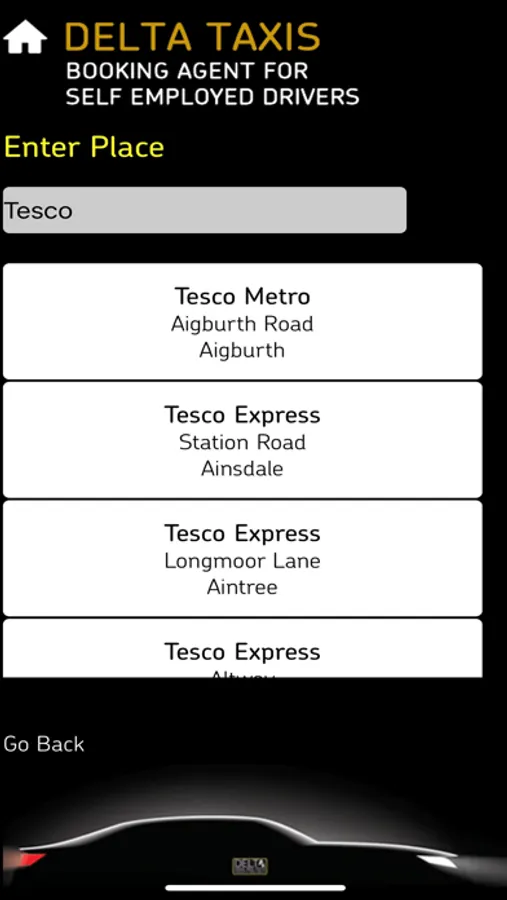 ENTER ADDRESS / ENTER PLACE OF INTEREST – enables you to manually enter your pick-up location by tapping direct into Delta Taxis very own street directory / places of interest.