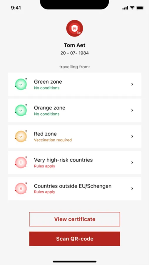 The app EUDCC BE is the official Belgian app to scan COVID-certificates for incoming travellers. It complies with the European directive on EU Digital COVID-certificates. By scanning the QR code of the certificate, the app will validate which rules should apply when entering Belgium. The app will show basic user information, such as name and birthdate. That way, a certificate can be validated and checked.