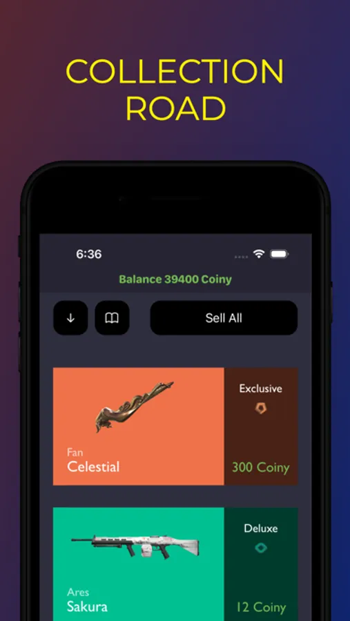 Collection Section can be found on the "Inventory Screen" by clicking listing button. This screen shows the skins that has been already found or not by opening cases. If the skin was discovered from cases, it will be shown by it's image. You can get more information about skins by clicking on the cells.