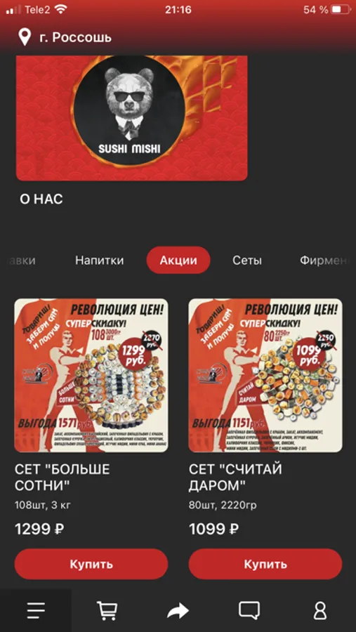 В приложении вы можете заказать доставку РОЛЛОВ, АССОРТИ СЕТОВ в г. Россошь и г. Лиски.