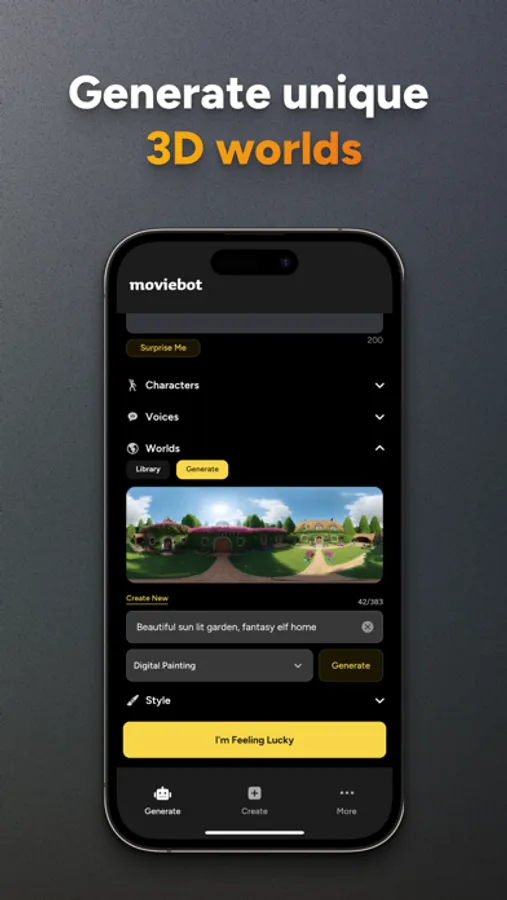 MovieBot transforms your text into animated video instantly. Simply type a story topic and MovieBot will generate an interactive 3D movie with talking characters based on your prompt. You can even generate your own personal avatars and worlds!