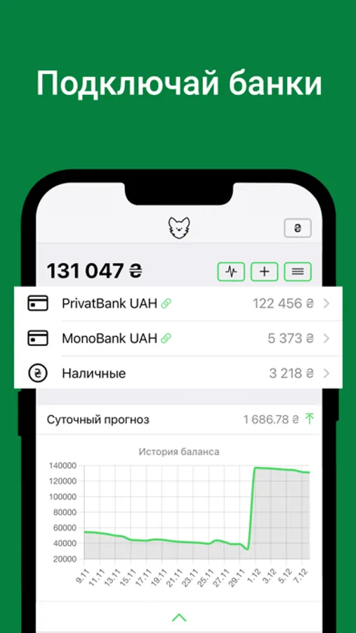 • Отображение состояния счетов: нет необходимости открывать приложения банков, когда все карты, счета и наличные удобно отображаются в одном месте.