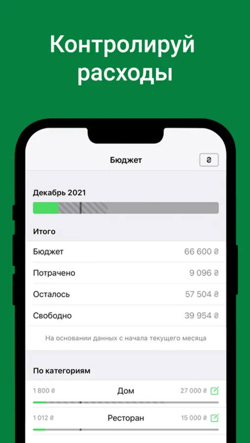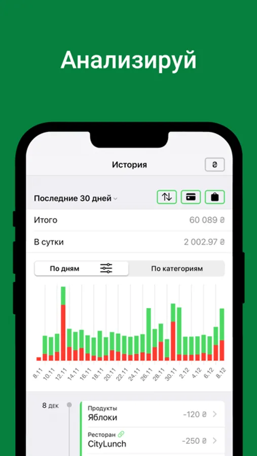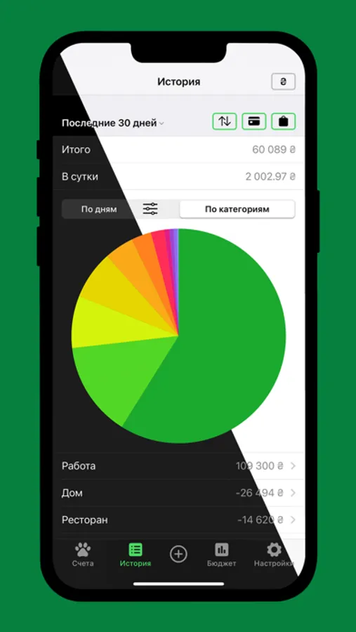 • Информативные графики покажут реальное состояние расходов и доходов по различным категориям.