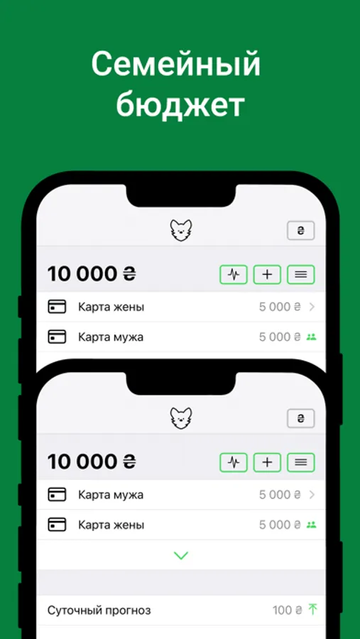 • Семейный доступ позволяет вместе с близким человеком вести учёт общих финансов.
