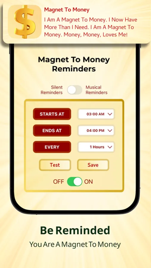 App Notifications & Reminders - Receive reminders all day long! With either musical or silent notifications, you will be reminded all day long that YOU are a Magnet to Money!
