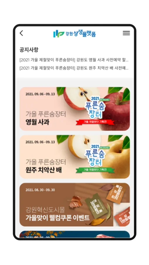 - 강원도 제철 특산품부터 도내 우수기업 상품, 우선구매 상품까지 다양한 품목을 소개합니다.