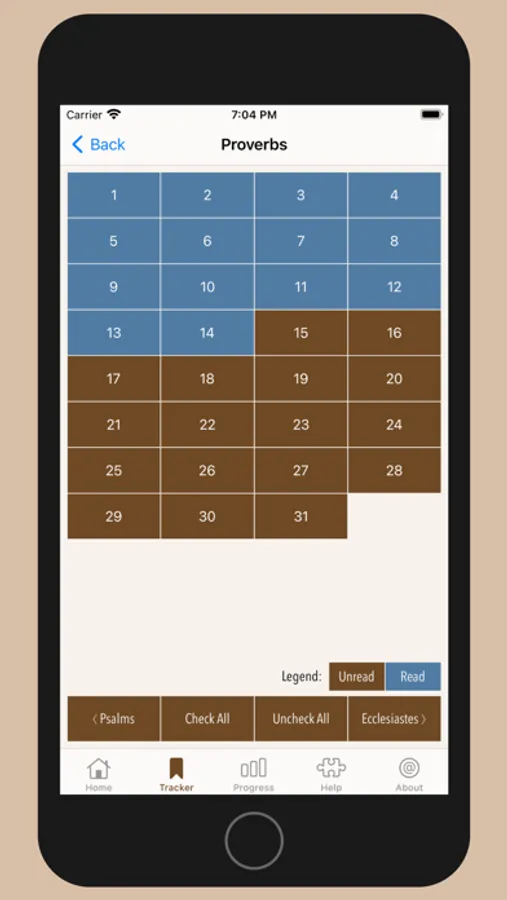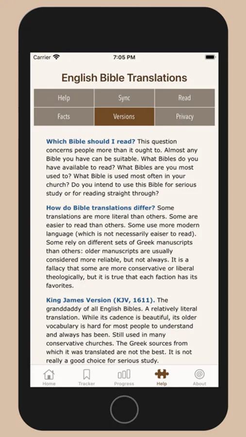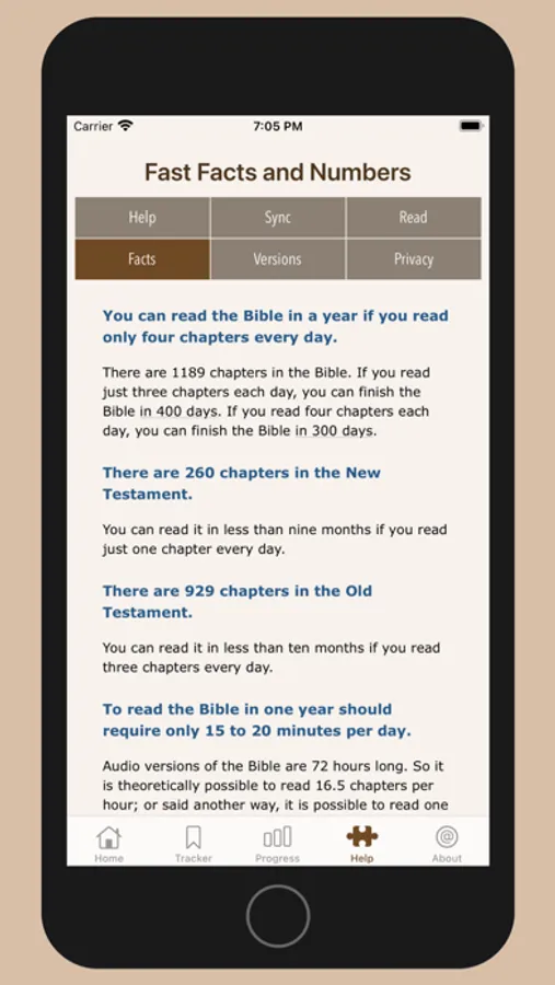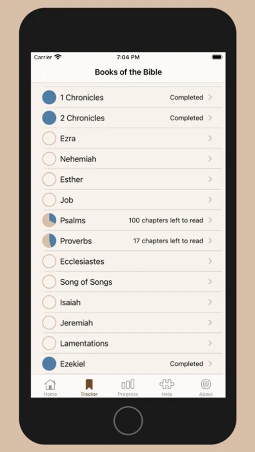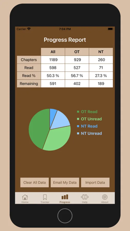 Shows your progress visually as a pie chart. Shows your progress through each book you're reading.