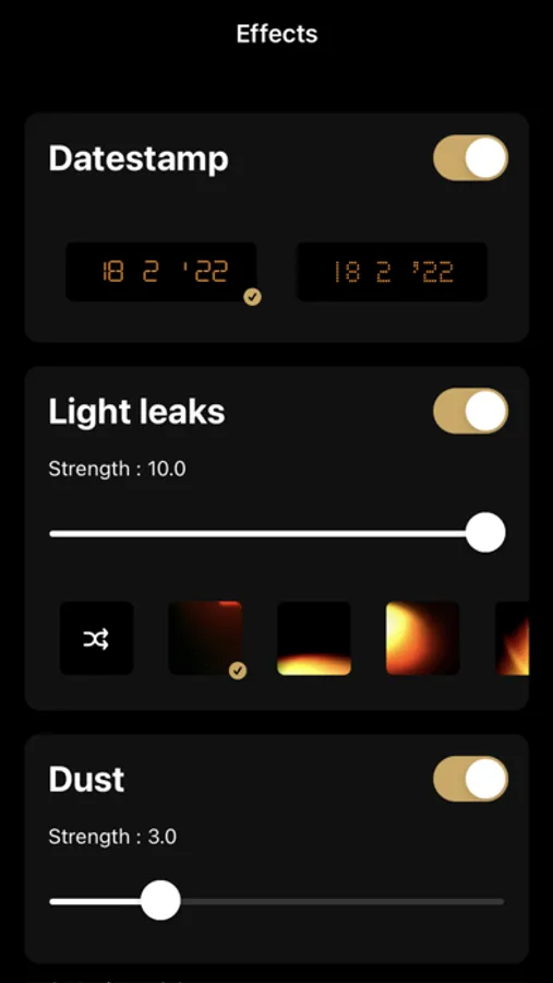 - Effects: Provide 5 kinds of film effects: Datestamp Watermark, Dust, Grain, Light Leaks and Colour Leaks.