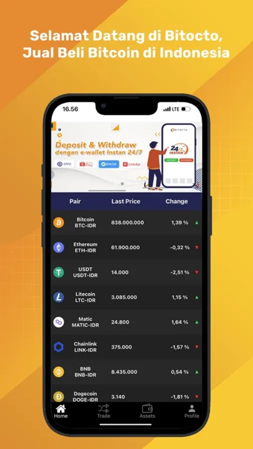 Buy or Sell Crypto easily with competitive transaction fees, instant spot trading execution and fast deposit and withdrawal of assets. Supports instant Rupiah (IDR) deposits and withdrawals 24/7!