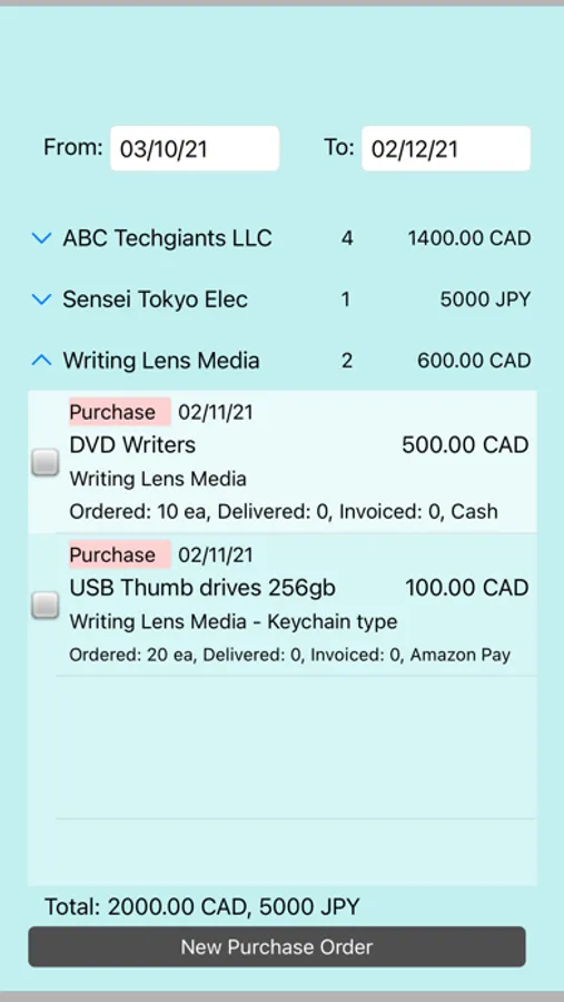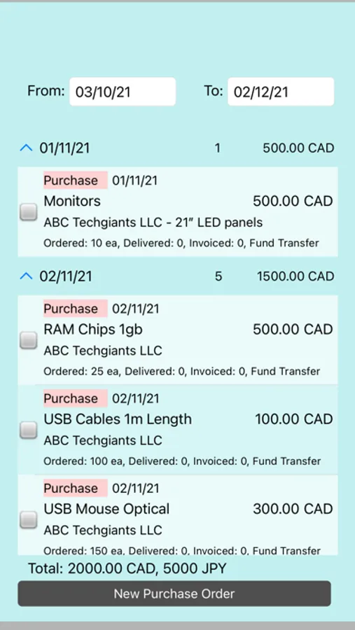 The orders can be grouped by date, partner, item, currency, etc parameters. You can also sort the orders by different methods.