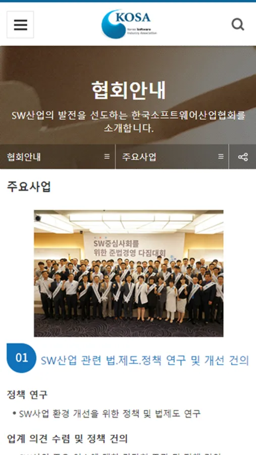 회원사와 산업계 소통을 강화를 위해 보다 다양한 채널을 만들어 균형있는 업계 발전과 환경개선을 위해 다양한 의견을 수렴할 수 있는 소통체계를 구축하는 동시에, 이러한 회원사의 의견을 고민하고 연구하여 정부나 산업계가 적기에 최선의 선택을 할 수 있도록 한발 빠른 정책을 준비해서 실행할 수 있도록 SW정책실행력을 강화하겠습니다.