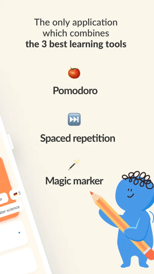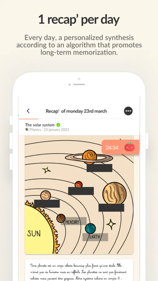 It's the only app that harnesses all of the scientifically proven neuro-educational principles that allow you to assimilate and retain information efficiently, with the least amount of effort. Ganesha thus brings together the 3 best mnemonic tools: the spaced repetition, the magic felt and the Pomodoro.