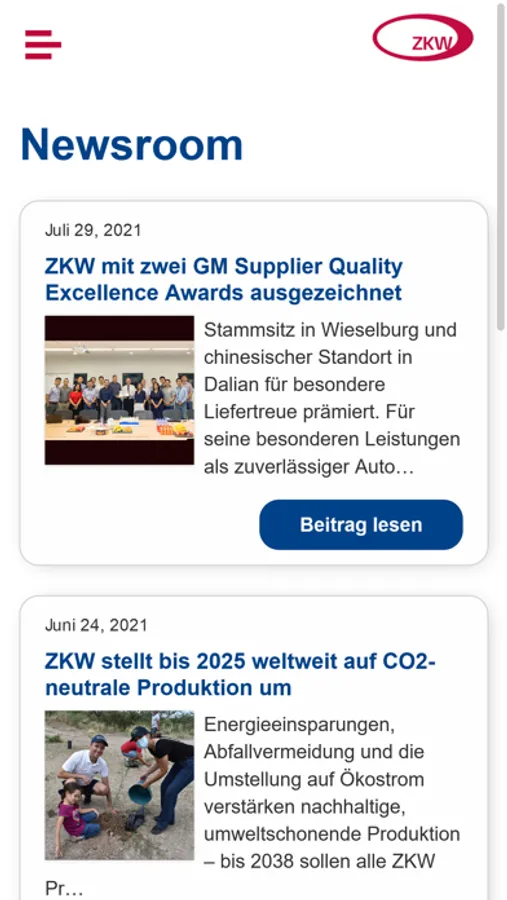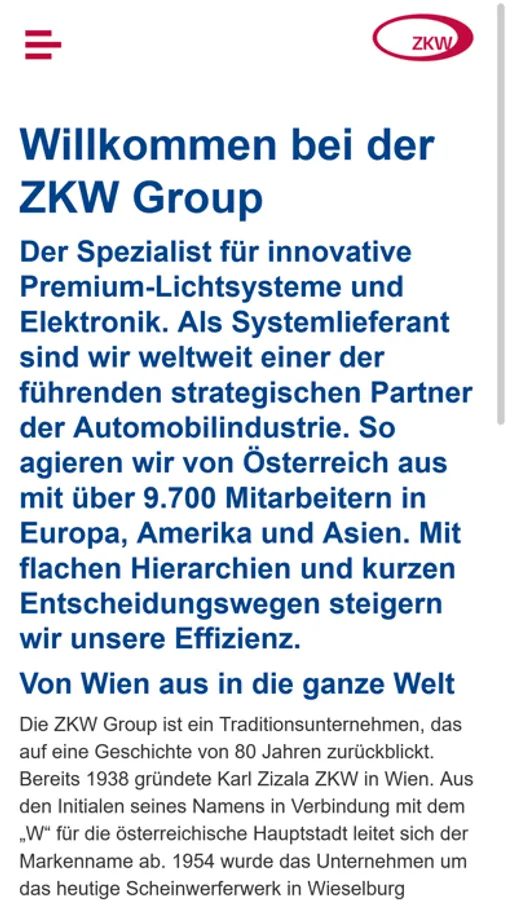 The myZKW app brings together current news and information from the entire international group. It allows users to quickly and easily receive corporate news worldwide and around the clock through the app on their company or private phones. The app offers up to date information on the company for stakeholders and potential applicants in the public area.