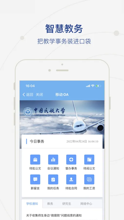 中国民航大学移动APP充分利用学校数据中心的资源优势,结合校内各门户网站、管理系统、教学科研协作应用平台内容,打破信息壁垒、实现数据共享、便捷师生查询、助力教学科研,为航大师生提供一站式的智慧校园移动服务。