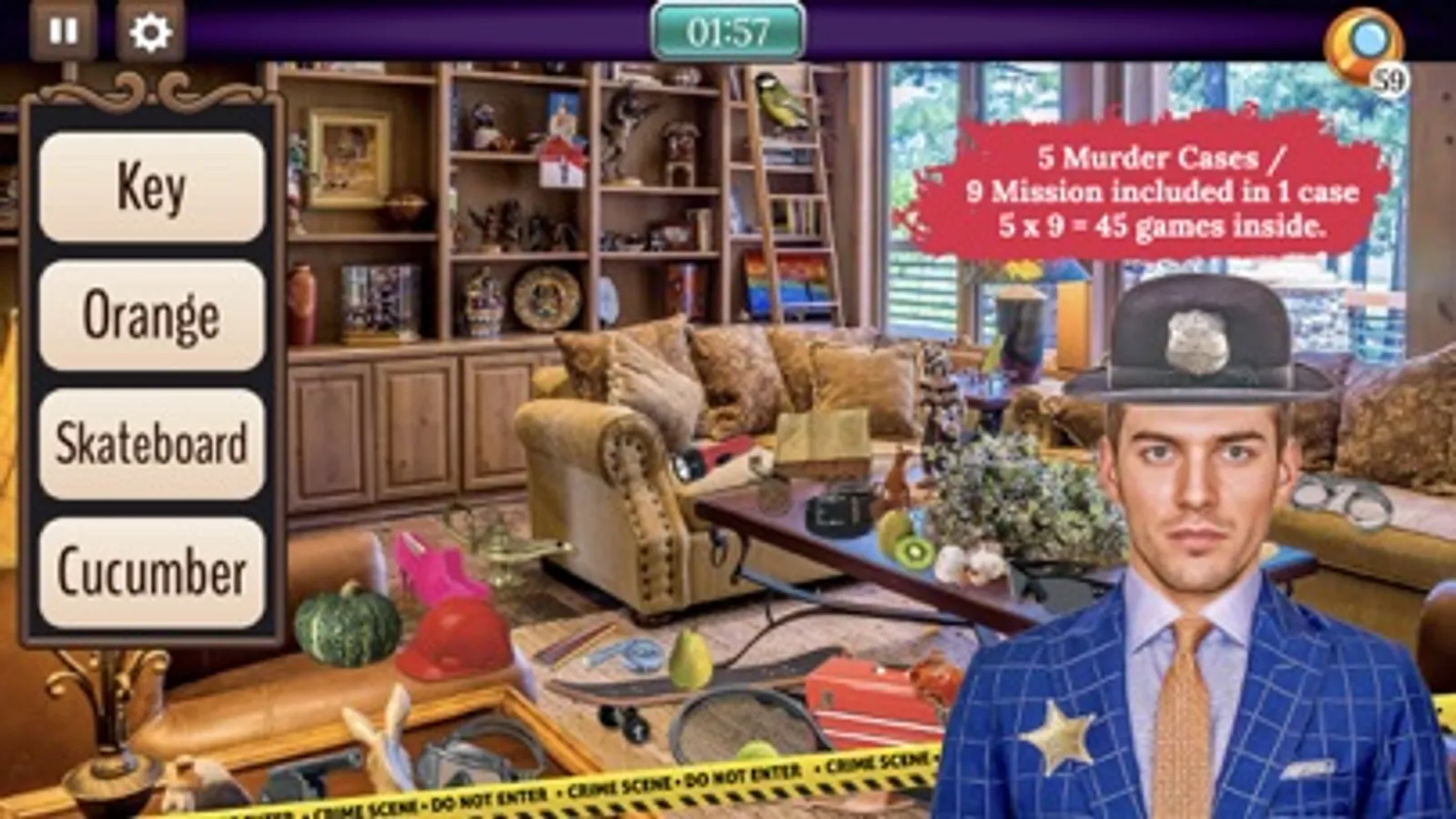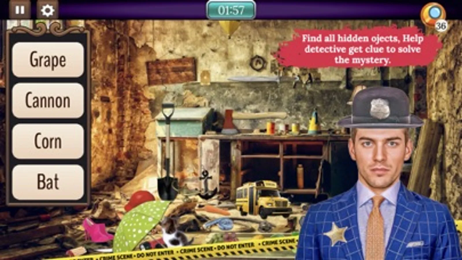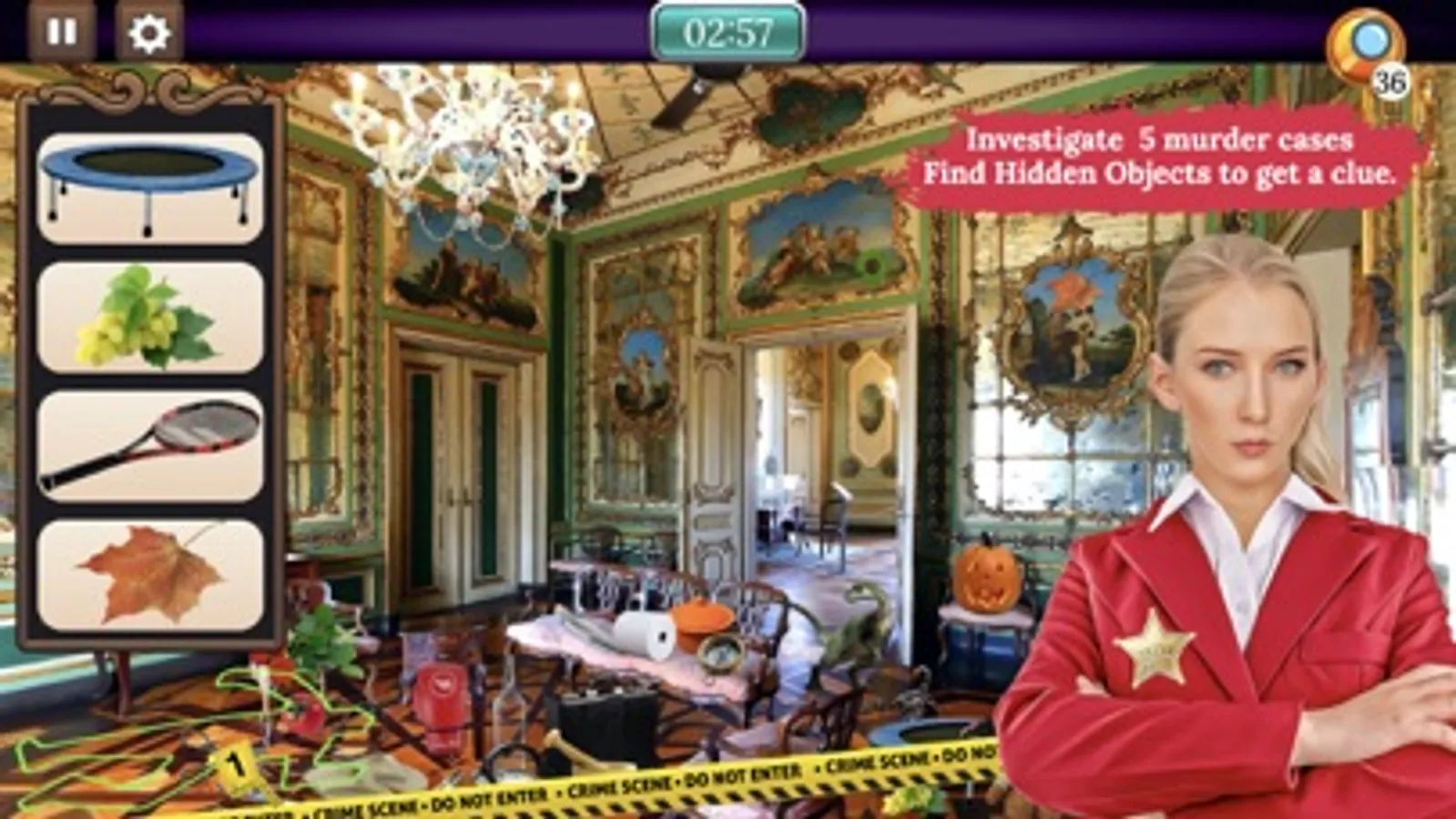 You have to find hidden objects to unravel the murder case step by step are: reveal the crime scene - identify the victim - discover a weapon that was used in the crime - identify the suspect - find out the motive of the crime.