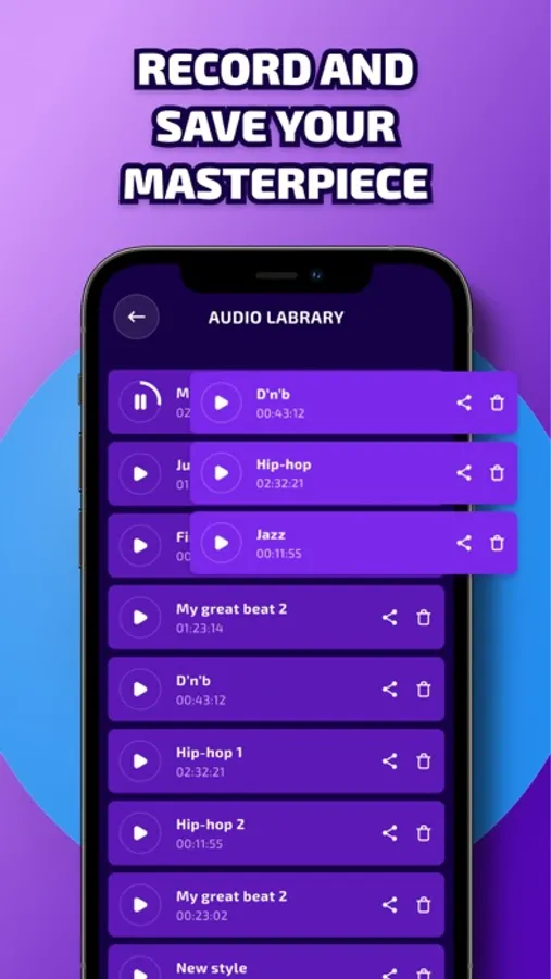 Every time when you freestyle, you can record your masterpiece and then listen to it in the audio library or share it with a friend.