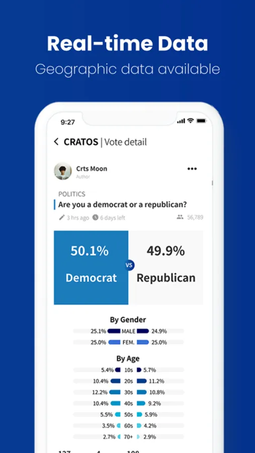 Cratos is a V2E cryptocurrency that can be earned on the Cratos app, a real-time voting platform that a user can generate a vote topic and others can vote for their answers. The vote results are displayed with the geographic data sorted by gender and age. This is the global version of the Cratos app, which has gained 200K+ downloads & 60K+ users from the Korean market.