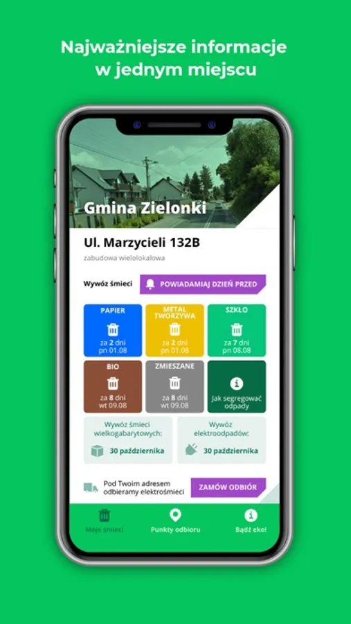 Moje śmieci – zakładka na temat harmonogramu i zasad segregowania odpadów w Twojej gminie. Wystarczy, że zweryfikujesz swój adres, aby w aplikacji pojawił się przejrzysty terminarz z konkretnymi datami ich wywozu. Dzięki wygodnej funkcji Powiadamiaj dzień przed już nigdy nie zapomnisz o przygotowaniu odpadów do odbioru! Moje śmieci poinformują Cię na kiedy zaplanowany jest odbiór odpadów segregowanych do czterech pojemników na papier, szkło, tworzywa sztuczne oraz bio, jak również odpadów wielkogabarytowych oraz zużytego sprzętu elektrycznego i elektronicznego.